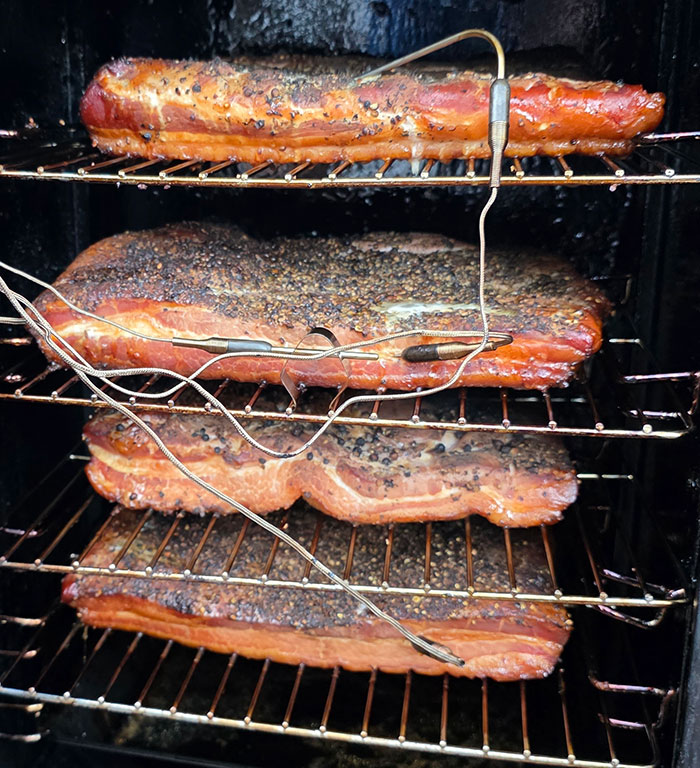 If you have them, insert your thermometer probes into the belly, or each belly cut if you split it to keep an eye on their temperatures. If your thermometer has it, also place the air probe in the smoker chamber to monitor the actual smoker chamber temperature, I like to do this since I don’t trust my smoker built-in gauge.