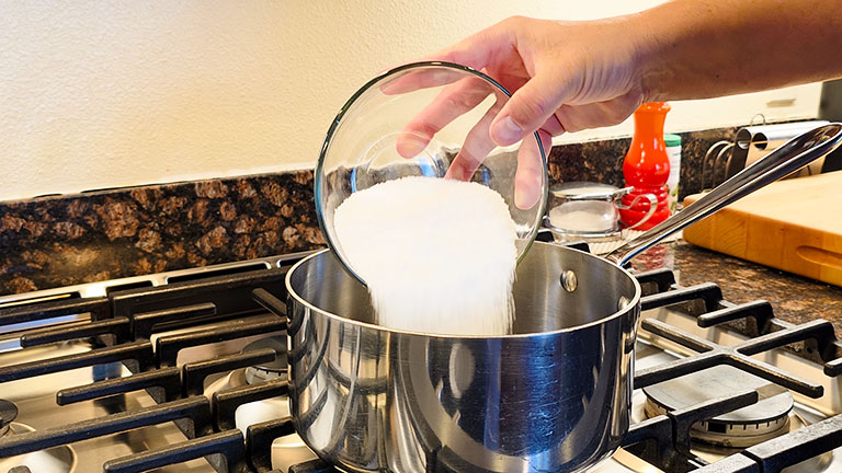 Once ready, measure the second half a gallon of water or the apple cider if you used molasses in the first step. If I use water, I like to add ice cubes to my measuring cup to help cool down the whole solution even faster. I would not recommend using ice cubes with apple cider to prevent diluting it.