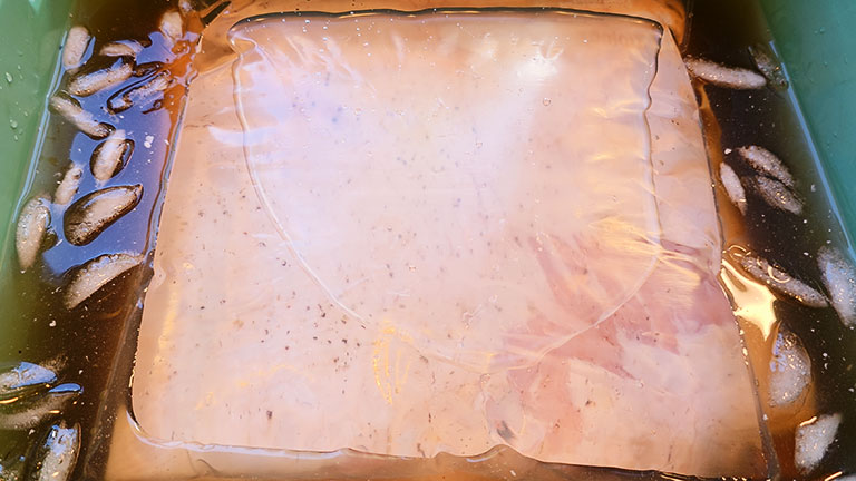Pour both all liquids into a large food safe plastic container big enough to fit not only the pork belly but also in your refrigerator. In my case I split the pork belly in half, not only to fit the box but also to fit into my smoker.
